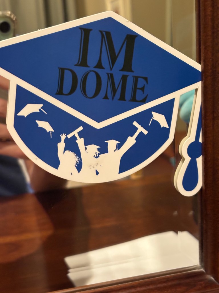 Note: This cut-out was part of a graduation pack that I purchased for the party for my twins. It became a running joke over the summer as I finished each aspect of Phase I Parenting (the way I’m now referring to the last 18 years). It is currently on my dresser mirror, and I think it’s finally true. I’m dome, at least with that journey.